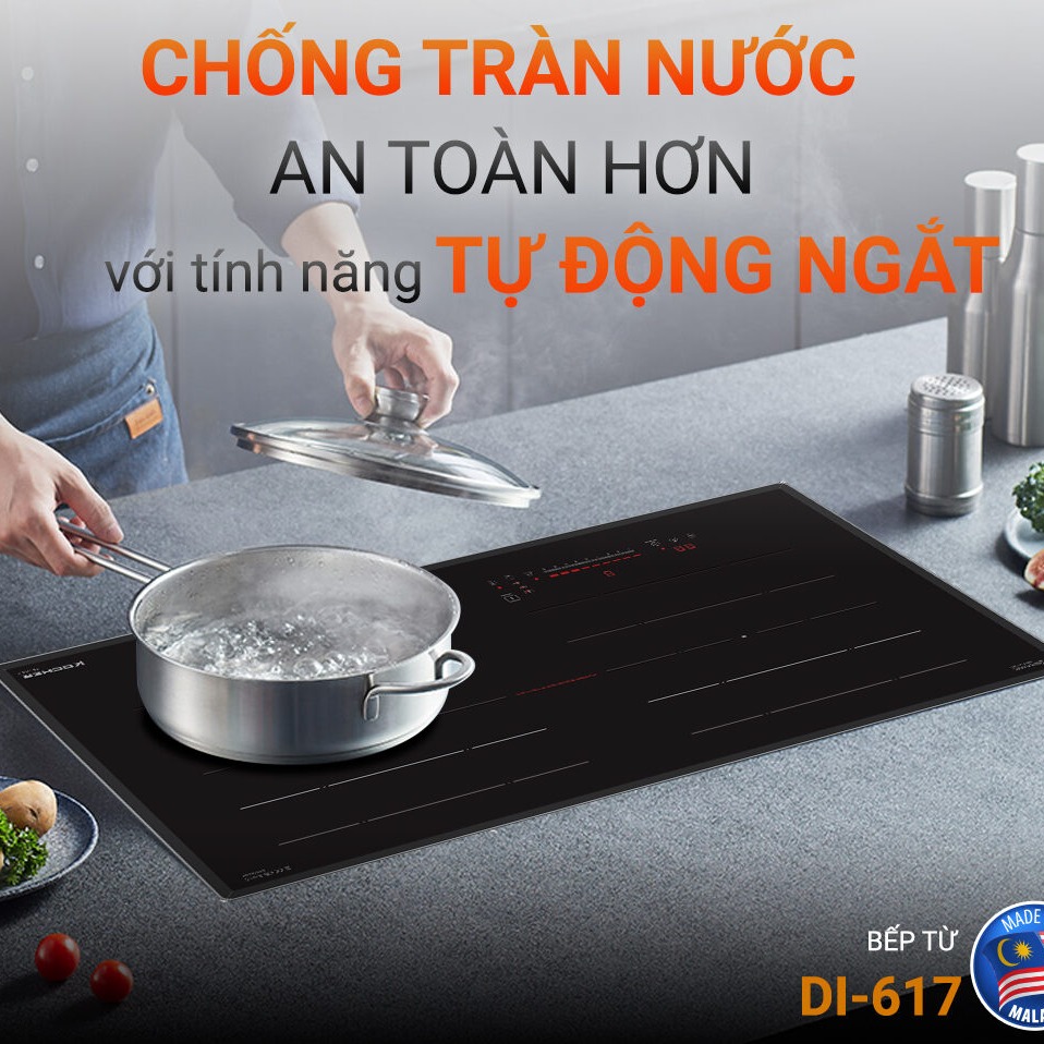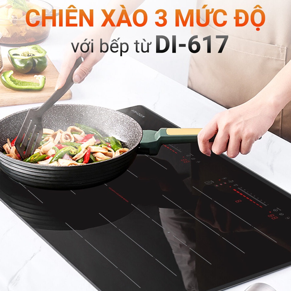 Bếp từ DI-617 mang thiết kế sang trọng với mặt kính Keramik vát cạnh bo viền nhôm tinh tế. Trang bị linh kiện Siemens Germany cho hiệu suất bền bỉ, 9 mức công suất và tính năng Booster giúp nấu nhanh, tiết kiệm thời gian. Các chế độ chiên, xào, giữ ấm linh hoạt đáp ứng đa dạng nhu cầu nấu nướng. Hệ thống an toàn thông minh đảm bảo an tâm tuyệt đối trong mỗi bữa ăn gia đình.