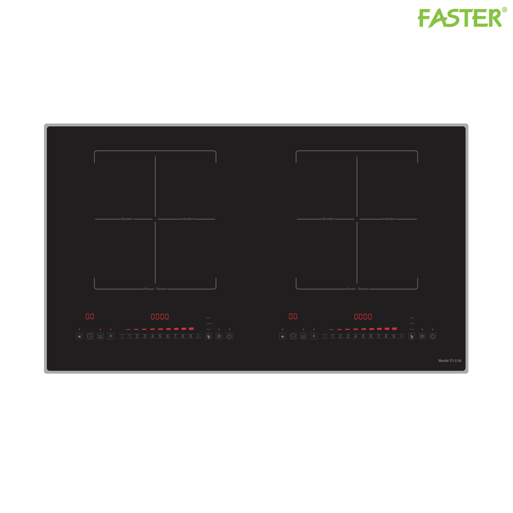 Bếp từ đôi Faster FS 518I là mẫu bếp từ mới của Faster xuất xứ Malaysia được bo viền xung quanh bếp. Với các chức năng sôi liu riu, hâm nóng, chiên xào, booster, hẹn giờ, chống tràn, tạm dừng, khóa trẻ em và được trang bị công nghệ biến tần Inverter giúp tiết kiệm đến 30% điện năng. Bếp có tổng công suất 4000W, lò trái 2000W booster 2300W, lò phải 2000W booster 2300W.