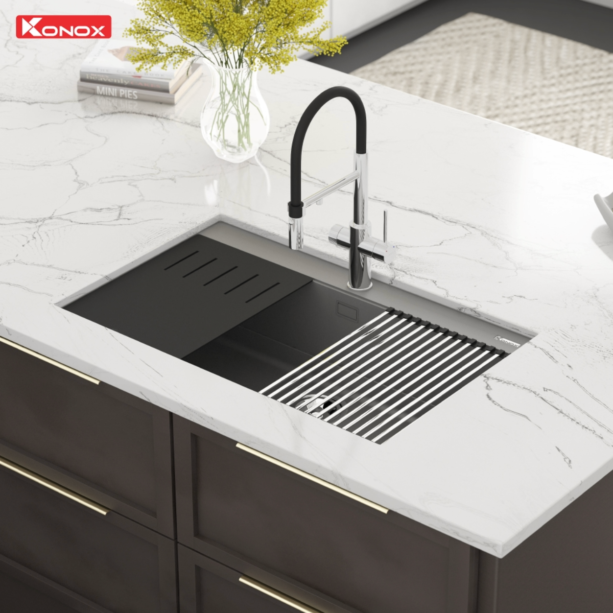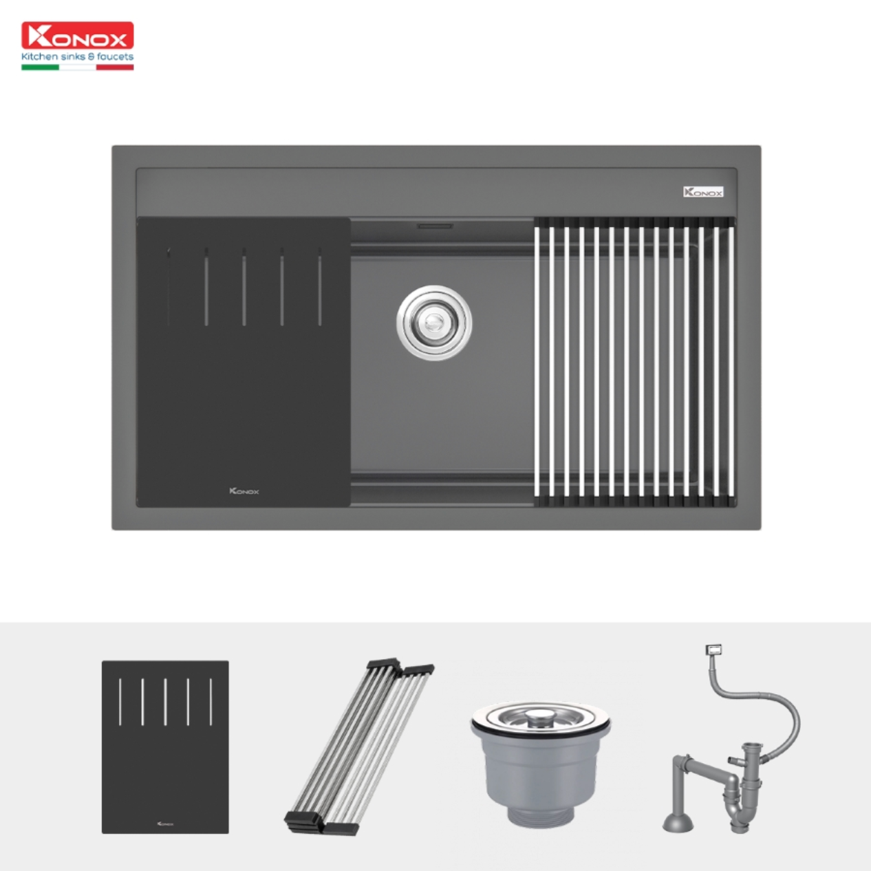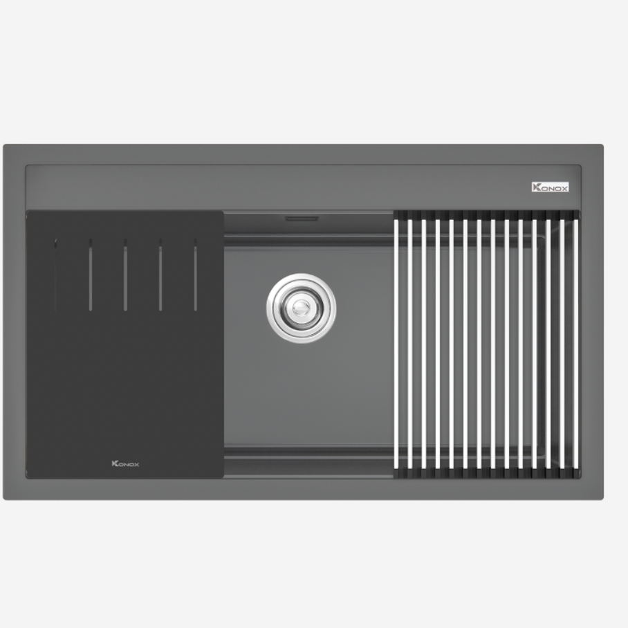 Chậu rửa bát Granite Sink Terra 860S Grey nằm trong bộ sưu tập chậu vòi đá cao cấp của Konox – Kiệt tác Ý trong lòng bếp Việt.