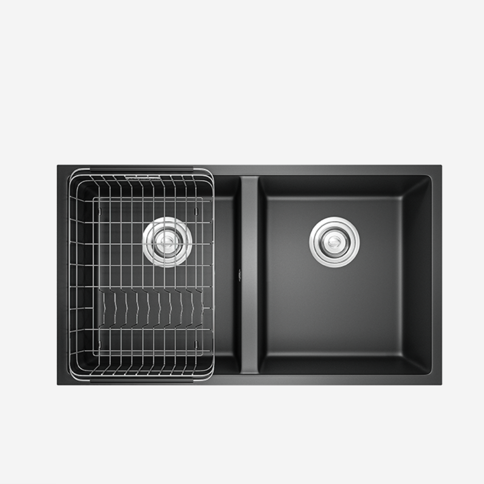 Bộ sưu tập chậu đá Veloci 760D với thiết kế chuyên biệt cho phong cách lắp đặt âm mặt đá theo xu hướng. Hai hố chậu dung tích đủ lớn cho phép bạn thỏa thích dọn rửa, nấu nướng.