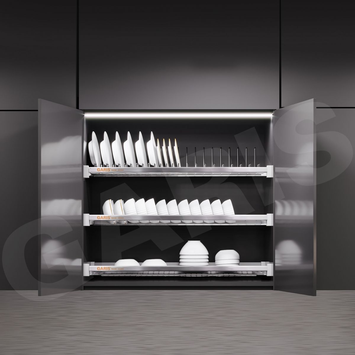 Gợi ý kết hợp phụ kiện khi thiết kế căn bếp : Căn bếp sẽ đẹp hơn khi kết hợp giá bát đĩa cố định GB07E với các sản phẩm khác trong BASE Series Kèm theo: 1 khay hứng nước, phiếu bảo hành, giấy chứng nhận Inox 304.