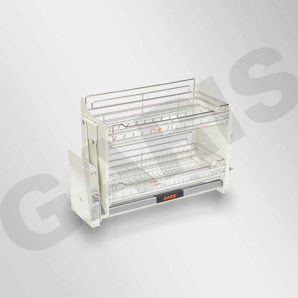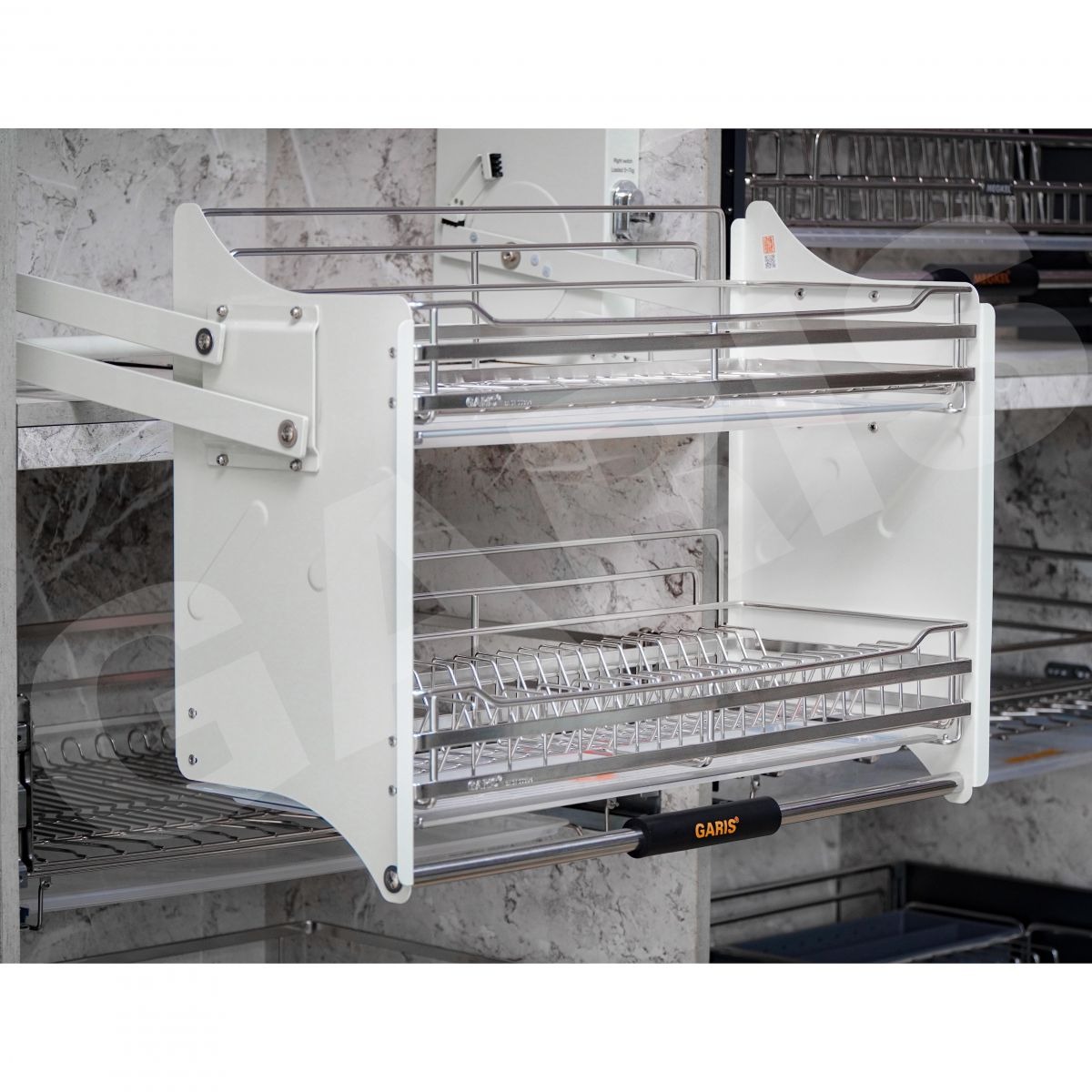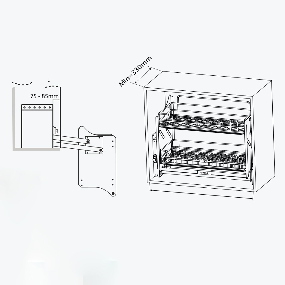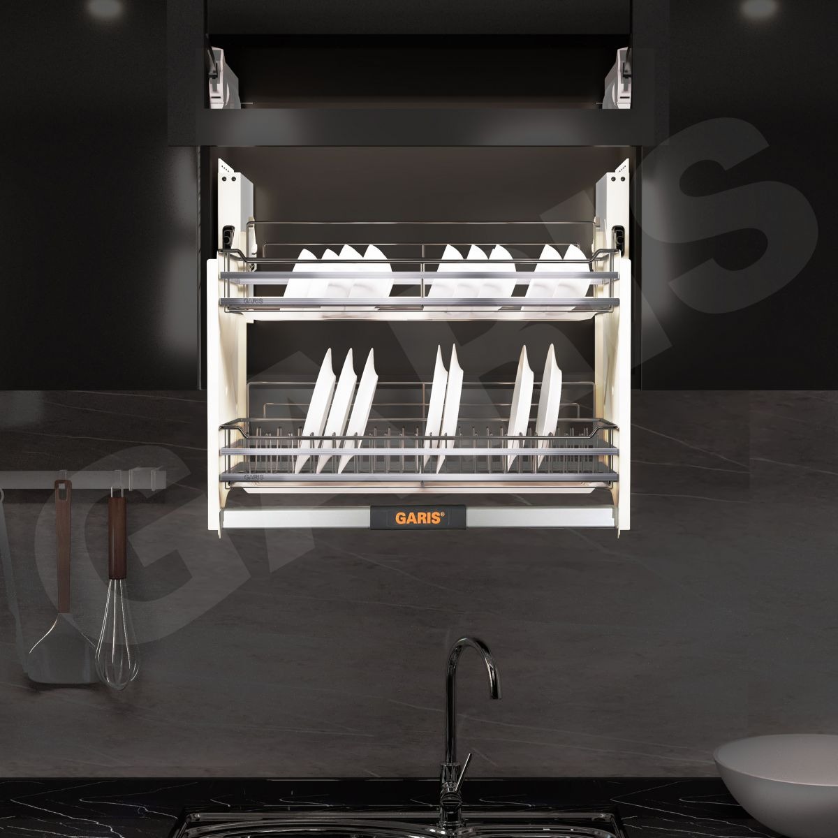 Gợi ý kết hợp phụ kiện khi thiết kế căn bếp : Căn bếp sẽ đẹp hơn khi kết hợp kệ bát đĩa nâng hạ mã GL06E với các sản phẩm khác trong BASE Series
