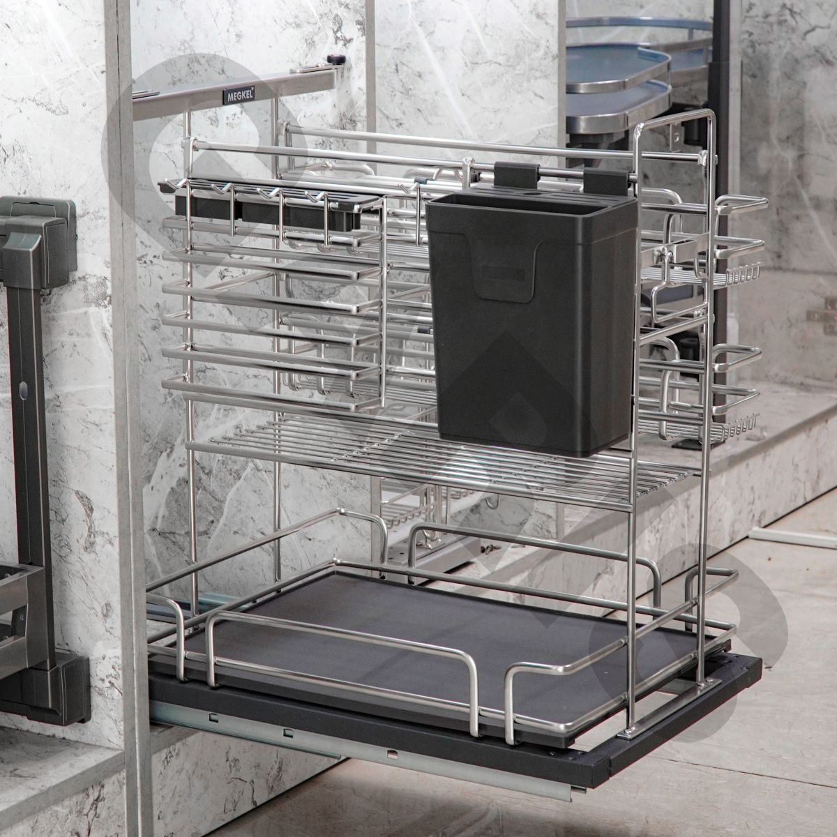 Kèm theo: Ray âm giảm chấn MEGKEL (bắt vách tủ), 1 bộ bắt mặt tùy chọn dùng cho cánh kéo, 1 khay hứng nước, phiếu bảo hành, giấy chứng nhận inox 304