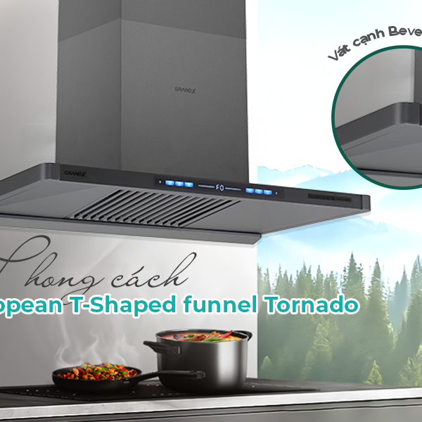 Hút mùi GX H70T82Pro mang phong cách European T-Shaped funnel Tornado với đường nét chữ T gọn gàng. Mặt kính cường lực vát cạnh Beveled edge tạo cảm giác cao cấp, hạn chế bám bẩn, dễ lau chùi. Thân máy màu xám Titan cho tổng thể bếp hiện đại, đồng bộ với nhiều phong cách nội thất.