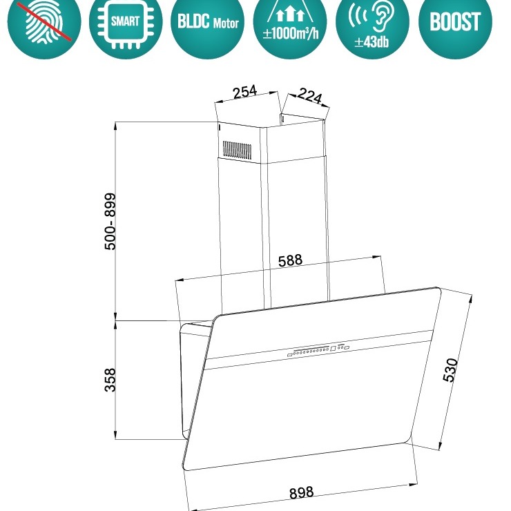 Kích thước sản phẩm 900R x 530S x 358-1257C mm
